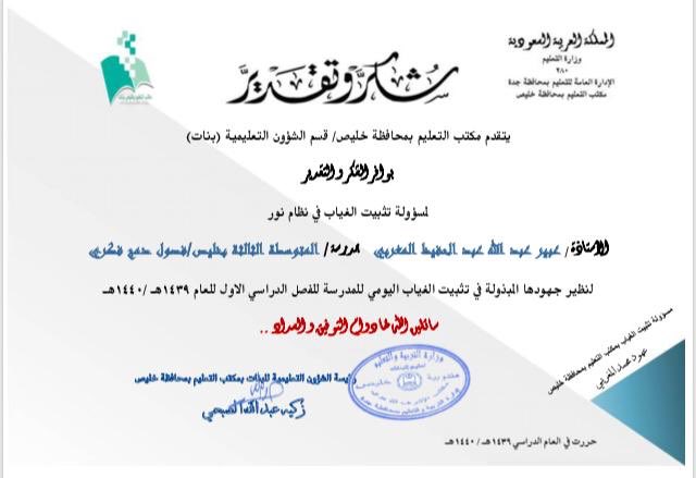 المتوسطة الثالثة بخليص A Twitter يتقدم مكتب تعليم خليص بنات بوافر الشكر وخالص التقدير والعرفان لمسؤولة تثبيت الغياب في نظام نور المساعد الاداري أ عبير المغربي نظير جهودها المتميزة في تثبيث الغياب اليومي للمدرسة